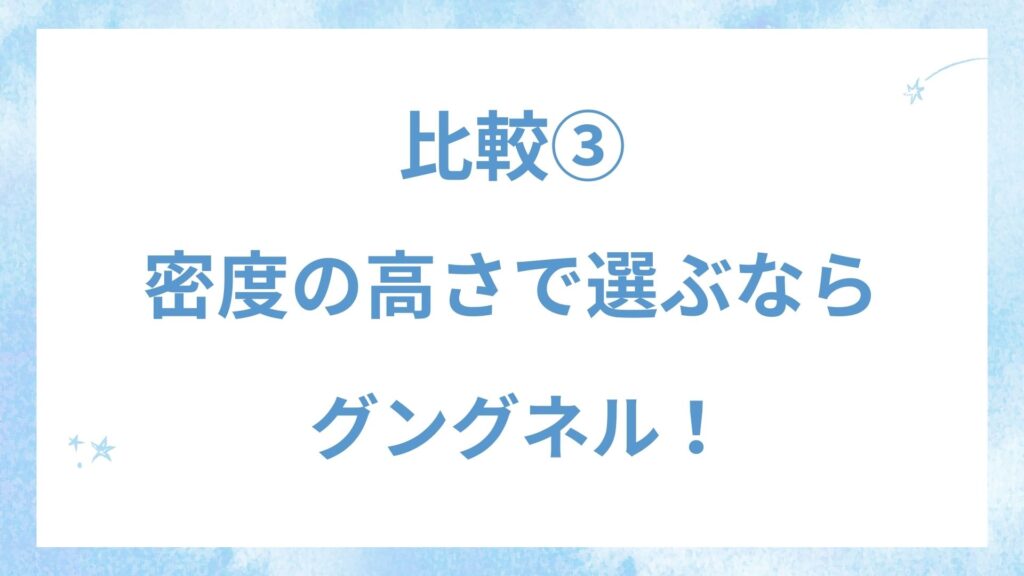 グングネルは99.5%と非常に高く、長く使ってもへたりにくいのが特徴です。