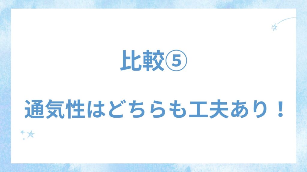 | 通気性 | メッシュカバー付きで蒸れにくい | 通気孔あり |